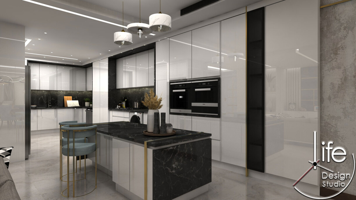 ✔️ آشپزخانه مدرن: کابینتهای براق سفید، کانتر سنگی مشکی و تجهیزات توکار آشپزخانه، فضایی مینیمال و کارآمد را شکل داده است.