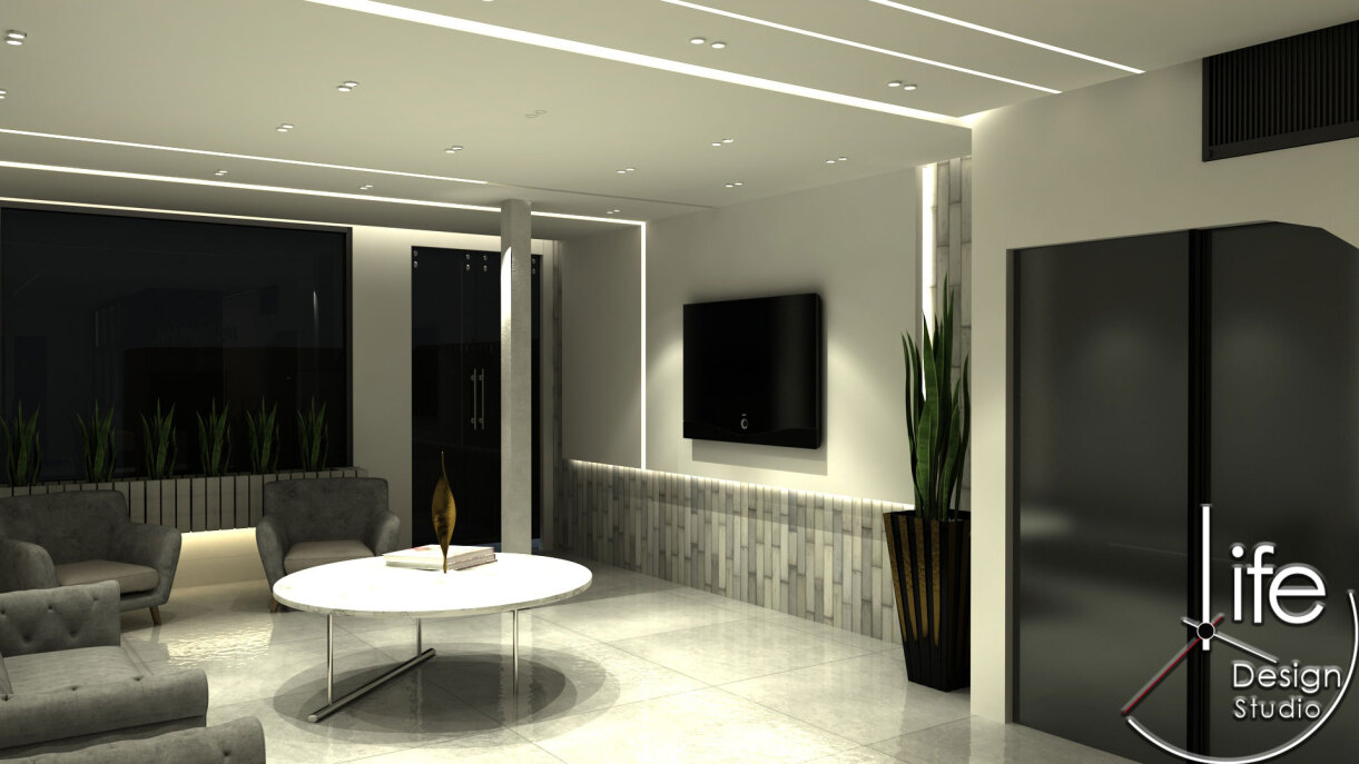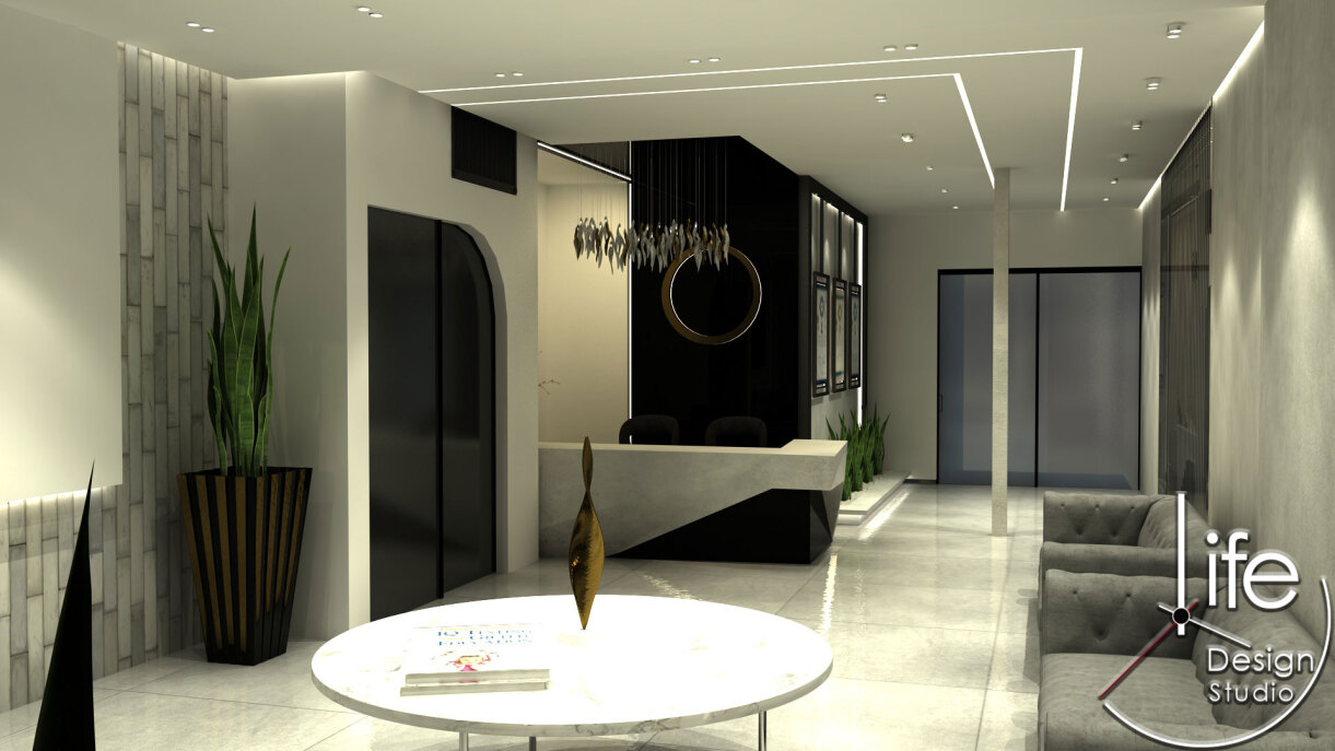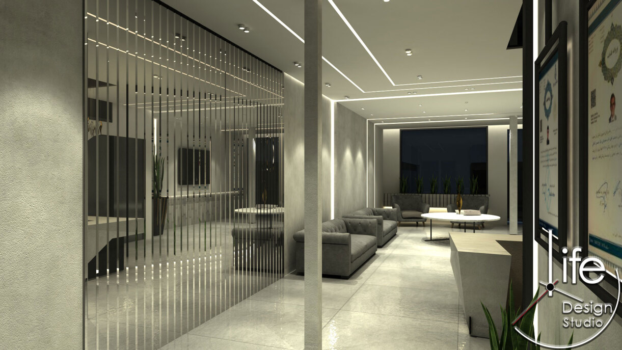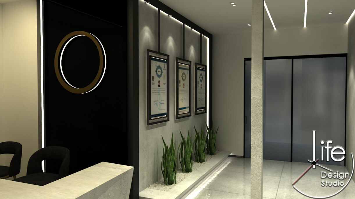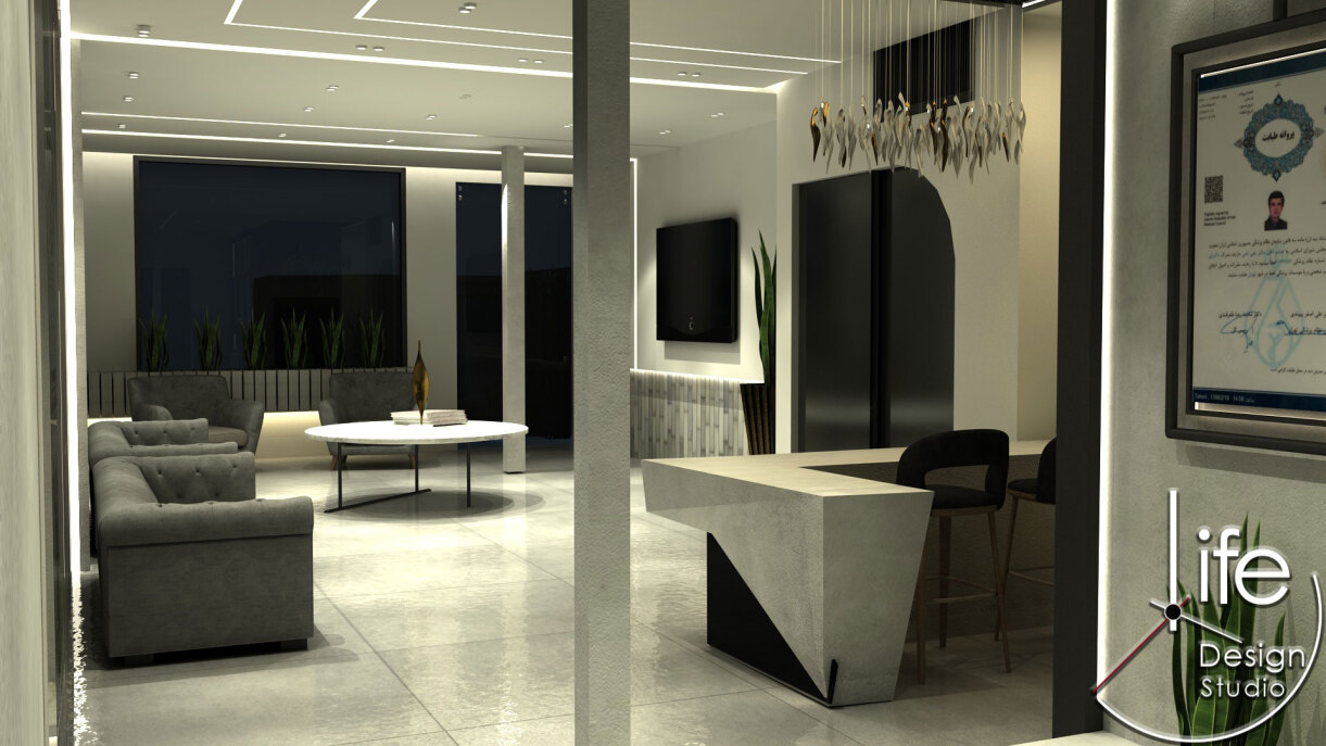خطوط ساده و هندسی، همراه با ترکیب رنگهای خنثی مانند سفید، طوسی و مشکی، به فضا حس پاکیزگی و نظم میدهد. میز پذیرش با طراحی مدرن و زاویهدار خود، به عنوان نقطهی کانونی فضا، توجه را به سمت خود جلب میکند و نمادی از نظم و کارایی است.